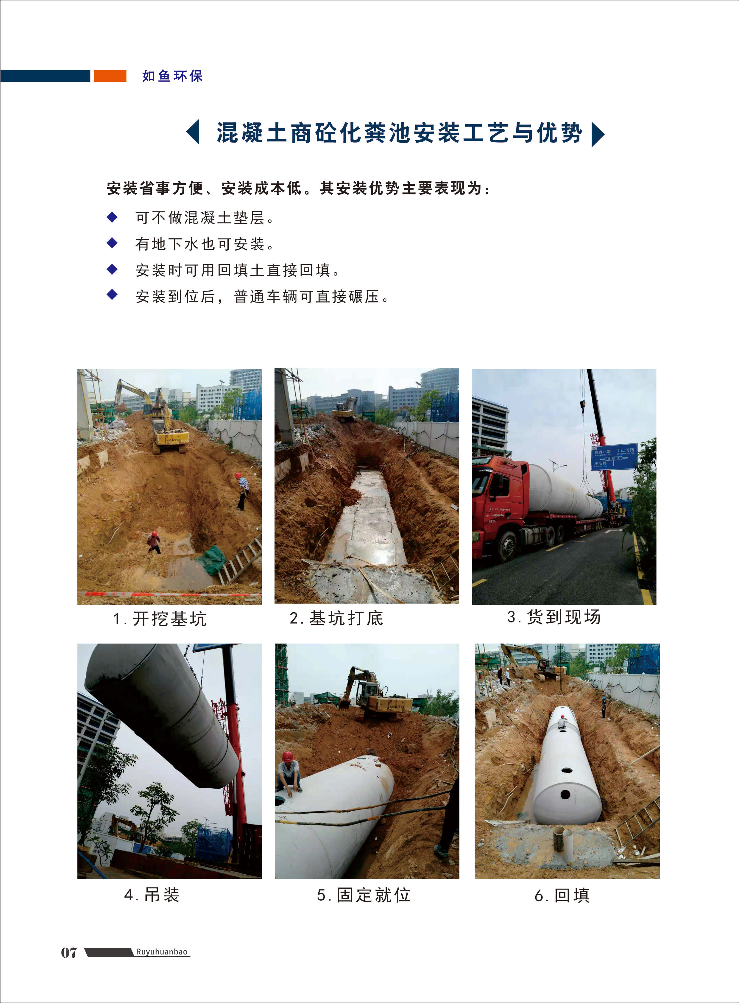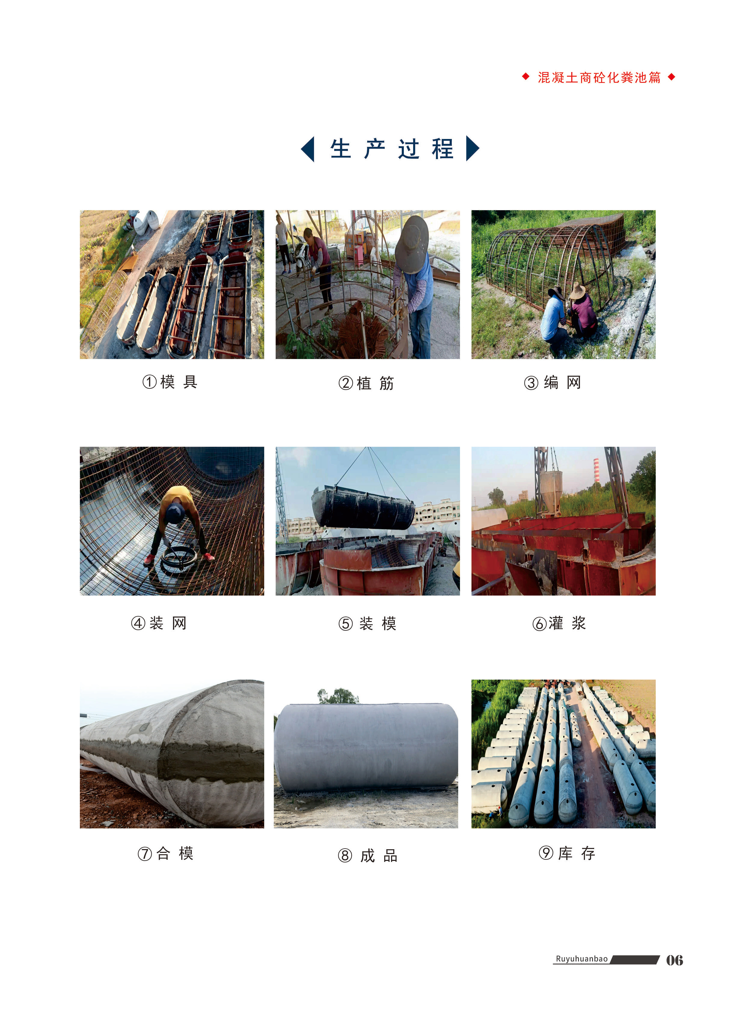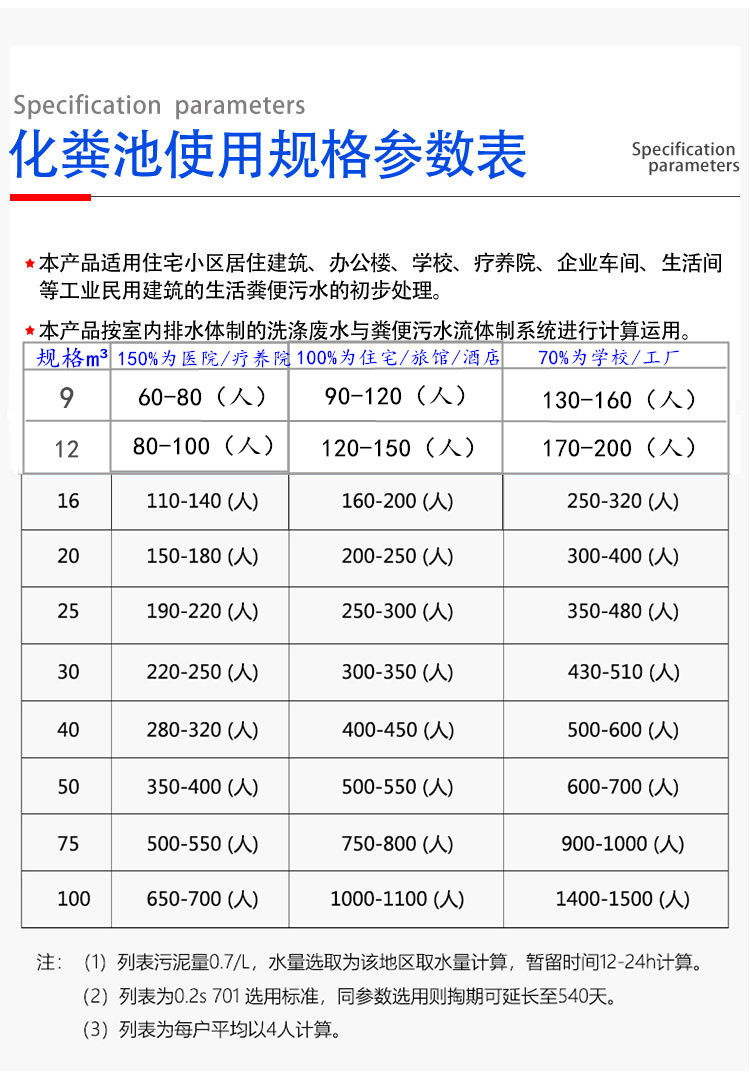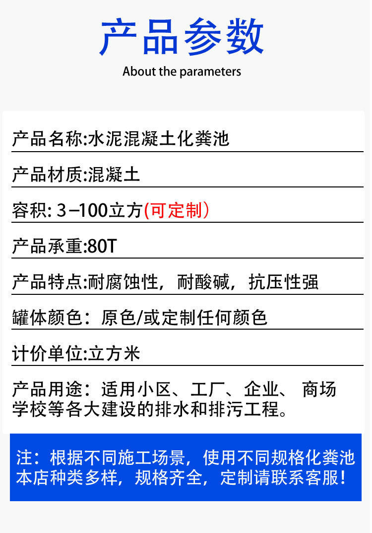 1. 定期检查化粪池井盖、通气管是否完好,若有损坏、丢失需及时更换;检查池体周边地面是否有沉降、裂缝、渗漏痕迹,发现问题及时处理(如采用水泥砂浆修补裂缝、重新封堵接口)。2. 按规定周期清掏化粪池(常规6-12个月一次,人流量大的场所可缩短至3-6个月),清掏时需选用专业清掏设备,避免撞击池体、损坏内部隔舱结构;清掏后的污泥需交由具备资质的专业机构处理,符合环保要求,严禁随意倾倒。3. 严禁向化粪池内倾倒建筑垃圾、化工废料、强酸强碱溶液、油污等有害物质,避免堵塞管道、腐蚀池体或影响污水处理效果;严禁在化粪池顶部及周边堆放重物、碾压或搭建建筑物。综上,水泥一体式化粪池凭借其结构坚固、密封可靠、适配性广、性价比高的优势,在生活污水预处理领域应用广泛。施工过程中需严格遵循相关规范与设计要求,重点把控基础处理、吊装安全、接口密封、回填压实等关键环节,确保工程质量与使用效果。 - 视频介绍
