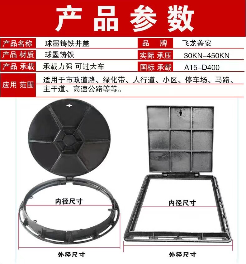 - 应用领域2:广泛应用于城市道路、广场、停车场、住宅区、工业区等场所,用于覆盖检查井、电缆井、排水井等各种地下设施井口,保障地下设施的安全和易于维护。