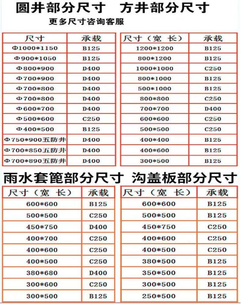 - 材料及工艺1:铸铁方井盖主要由灰铸铁或球墨铸铁制成。球墨铸铁井盖通过球化和孕育处理工艺,使石墨呈球状,其抗拉强度可达≥420MPa,屈服强度≥300MPa,强度与低碳钢材相当,是普通灰铁材料的三倍之多。