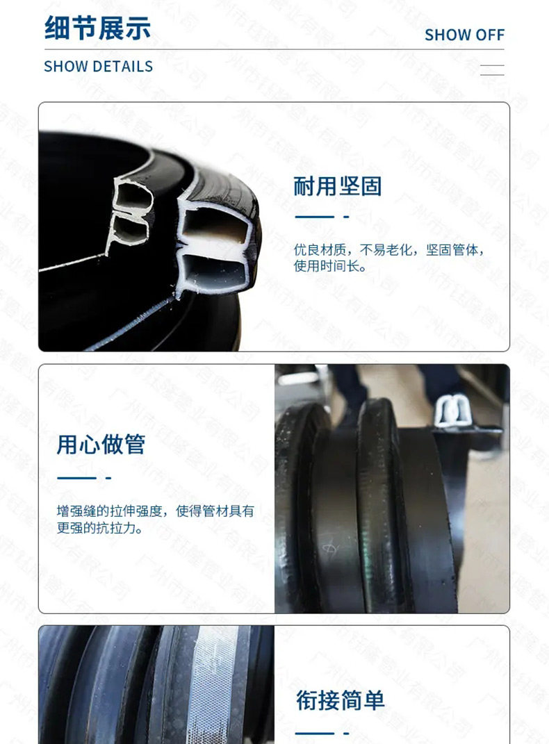 PP材料密度仅为0.91g/cm³左右,约为混凝土管的1/9、铸铁管的1/11,管材重量轻,运输和现场吊装便捷,可大幅降低施工机械投入和人力成本。接口采用承插式连接,操作简单快速,无需复杂的焊接设备或混凝土浇筑工序,能有效缩短施工周期。此外,管材可回收利用,生产和使用过程中无污染物排放,符合绿色建筑、环保工程的发展要求。(五)耐老化与抗低温性能良好